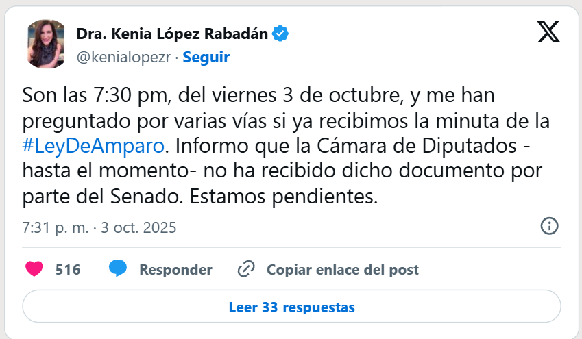“Son las 7:30 pm, del viernes 3 de octubre, y me han preguntado por varias vías si ya recibimos la minuta de la #LeyDeAmparo. Informo que la Cámara de Diputados -hasta el momento- no ha recibido dicho documento por parte del Senado. Estamos pendientes”, publicó en su cuenta de X.