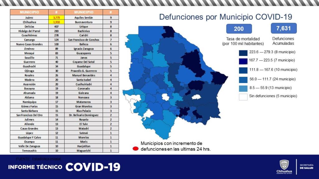Número total de fallecimientos por municipio: 3,773 Ciudad Juárez, 1,910 Ciudad de Chihuahua, 407 Delicias, 283 Parral, 278 Cuauhtémoc, 124 Camargo, 100 Nuevo Casas Grandes, 89 Jiménez, 83 Meoqui, 71 Saucillo, 40 Guerrero, 34 Guachochi, 30 Ojinaga, 26 Rosales, 20 Ascensión, 20 Madera, 19 Bocoyna, 19 Ahumada, 17 Namiquipa, 18 Aldama, 15 Gómez Farías, 15 Santa Bárbara, 13 Allende, 15 San Francisco del Oro, 14 Julimes, 13 Casas Grandes, 12 López, 11 Guadalupe y Calvo, 11 Ocampo, 10 Valle de Zaragoza, 10 Temósachic, 9 Buenaventura, 9 Aquiles Serdán, 8 Bachíniva, 8 Carichí, 8 Urique, 7 San Francisco de Conchos, 6 Ignacio Zaragoza, 6 Balleza, 5 Coyame del Sotol, 5 Janos, 5 Guazapares, 5 Guadalupe D. B., 5 Praxedis G. Guerrero, 4 Galeana, 4 Santa Isabel, 4 Cusihuiriachi, 4 Coronado, 4 Manuel Benavides, 3 Riva Palacio, 3 Gran Morelos, 3 Nonoava, 3 Matamoros, 2 Dr. Belisario Domínguez, 2 Moris, 2 El Tule, 2 Matachí, 2 Rosario, 1 Huejotitán, 1 Morelos, 1 Satevó, 1 Maguarichi.