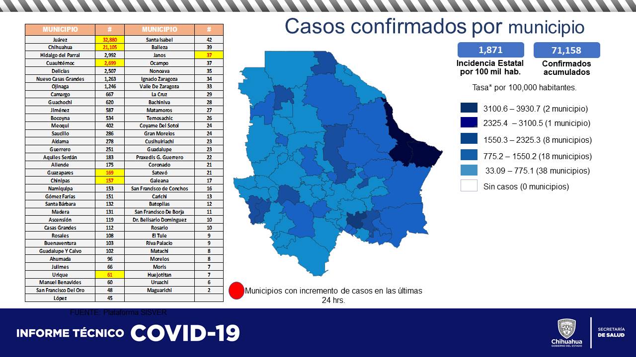 Acumulado de casos confirmados por municipio: 32,880 Juárez, 21,105 Chihuahua, 2,992 Hidalgo del Parral, 2,699 Cuauhtémoc, 2,508 Delicias, 1,263 Nuevo Casas Grandes, 1,246 Ojinaga, 669 Camargo, 621 Guachochi, 587 Jiménez, 534 Bocoyna, 402 Meoqui, 286 Saucillo, 278 Aldama, 252 Guerrero, 183 Aquiles Serdán, 176 Allende, 169 Guazapares, 156 Namiquipa, 157 Chínipas, 151 Gómez Farías, 132 Santa Bárbara, 131 Madera, 121 Ascensión, 112 Casas Grandes, 110 Rosales, 103 Buenaventura, 102 Guadalupe y Calvo, 96 Ahumada, 68 Julimes, 60 Manuel Benavides, 61 Urique, 48 San Francisco del Oro, 45 López, 42 Santa Isabel, 39 Balleza, 37 Janos, 35 Nonoava, 34 Ignacio Zaragoza, 33 Valle de Zaragoza, 37 Ocampo, 29 La Cruz, 28 Bachíniva, 27 Matamoros, 26 Temósachic, 24 Gran Morelos, 24 Coyame del Sotol, 23 Cusihuiriachi, 23 Guadalupe, 22 Praxedis G. Guerrero, 21 Satevó, 21 Coronado, 17 Galeana, 16 San Francisco de Conchos, 13 Carichí, 11 Batopilas, 11 San Francisco de Borja, 10 Dr. Belisario Domínguez, 10 Rosario, 9 El Tule, 9 Riva Palacio, 8 Moris, 8 Matachí, 7 Huejotitán, 7 Morelos, 5 Uruachi y 2 Maguarichi.