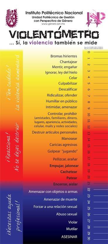 Además, indicó que la violencia dentro de la pareja se encuentra en los índices más altos en donde las mujeres sufrimos violencia, pues debo recordar que la violencia también se mide y no es solo la que se manifiesta de manera física, pues ya nos lo presenta este material didáctico, como una herramienta útil que contiene 3 escalas con colores diferentes que van mostrando el nivel de violencia que se padece; debo decir, que a pesar de que las violencias que se encuentran en el violentómetro no son necesariamente consecutivas sino, se pueden presentar de manera intercalada, debemos generar la conciencia de las conductas y tratos que recibimos dentro de nuestro entorno.