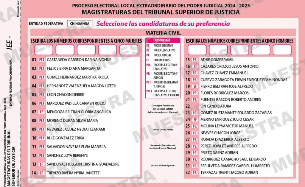 CHIHUAHUA, CHIH.– El Instituto Estatal Electoral de Chihuahua informa que, en la Jornada Electoral del 1 de junio de 2025, las personas votantes recibirán boletas para la Elección del Poder Judicial del Estado, donde aparecerán los nombres y números de las candidaturas a magistraturas, juezas y jueces.