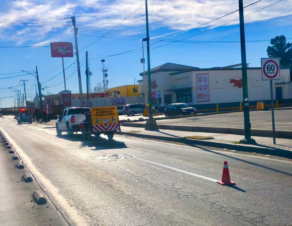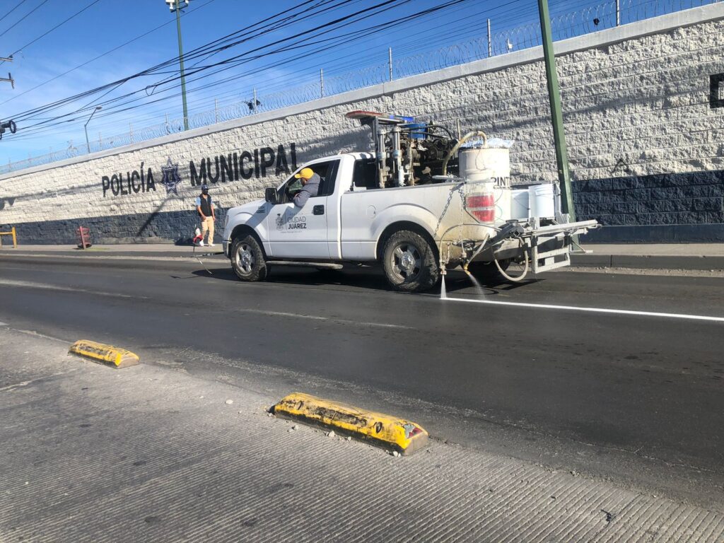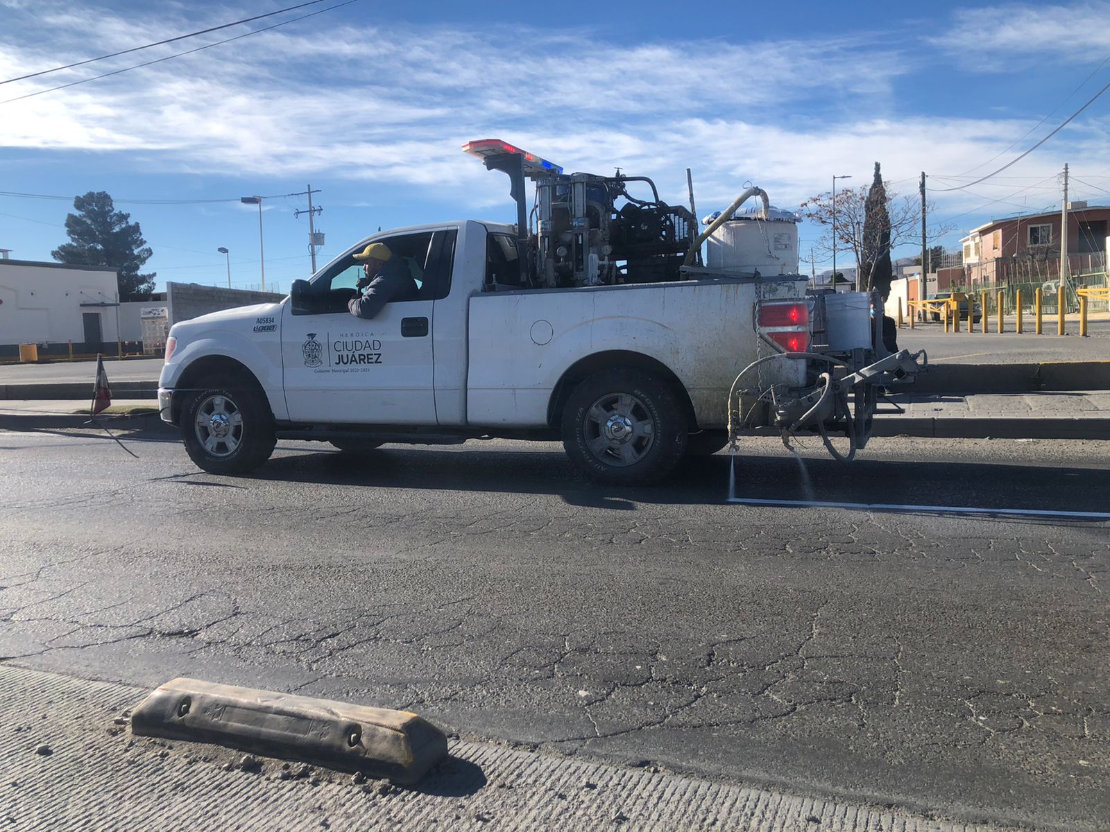 CD. JUAREZ, CHIH.- Personal del Departamento de Control de Tráfico, perteneciente a la Coordinación General de Seguridad Vial realizó trabajos de pintura para dividir los carriles en Eje Vial Juan Gabriel y Sanders.