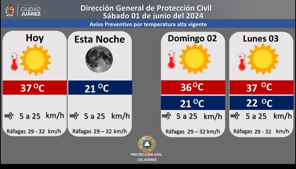 CD. JUAREZ, CHIH.- La Dirección General de Protección Civil informó que este fin de semana la temperatura estará en una máxima de 37 grados Centígrados y una mínima de 21, sin posibilidades de lluvias.