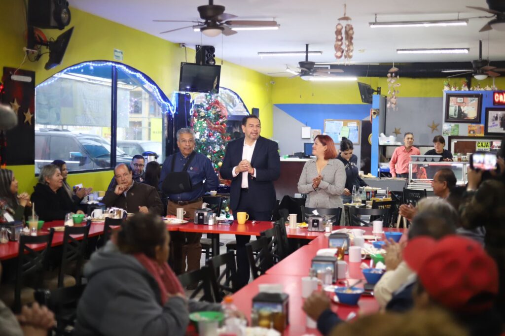 CD. JUAREZ, CHIH.- Esta mañana el Presidente Municipal, Cruz Pérez Cuéllar, asistió como invitado especial al desayuno navideño que organizaron los líderes de varias colonias del suroriente de la ciudad, en donde les extendió un agradecimiento por trabajar de la mano con el Municipio y les deseó una feliz Navidad.