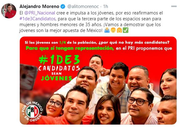 CIUDAD DE MEXICO.- El Partido Revolucionario Institucional (PRI) cree e impulsa a los jóvenes, por eso reafirmamos el 1 de 3 Candidatos, para que la tercera parte de los espacios sean para mujeres y hombres menores de 35 años. ¡Vamos a demostrar que los jóvenes son la mejor apuesta de México!, aseguró Alejandro Moreno, Presidente del Comité Ejecutivo Nacional (CEN), de este instituto político.