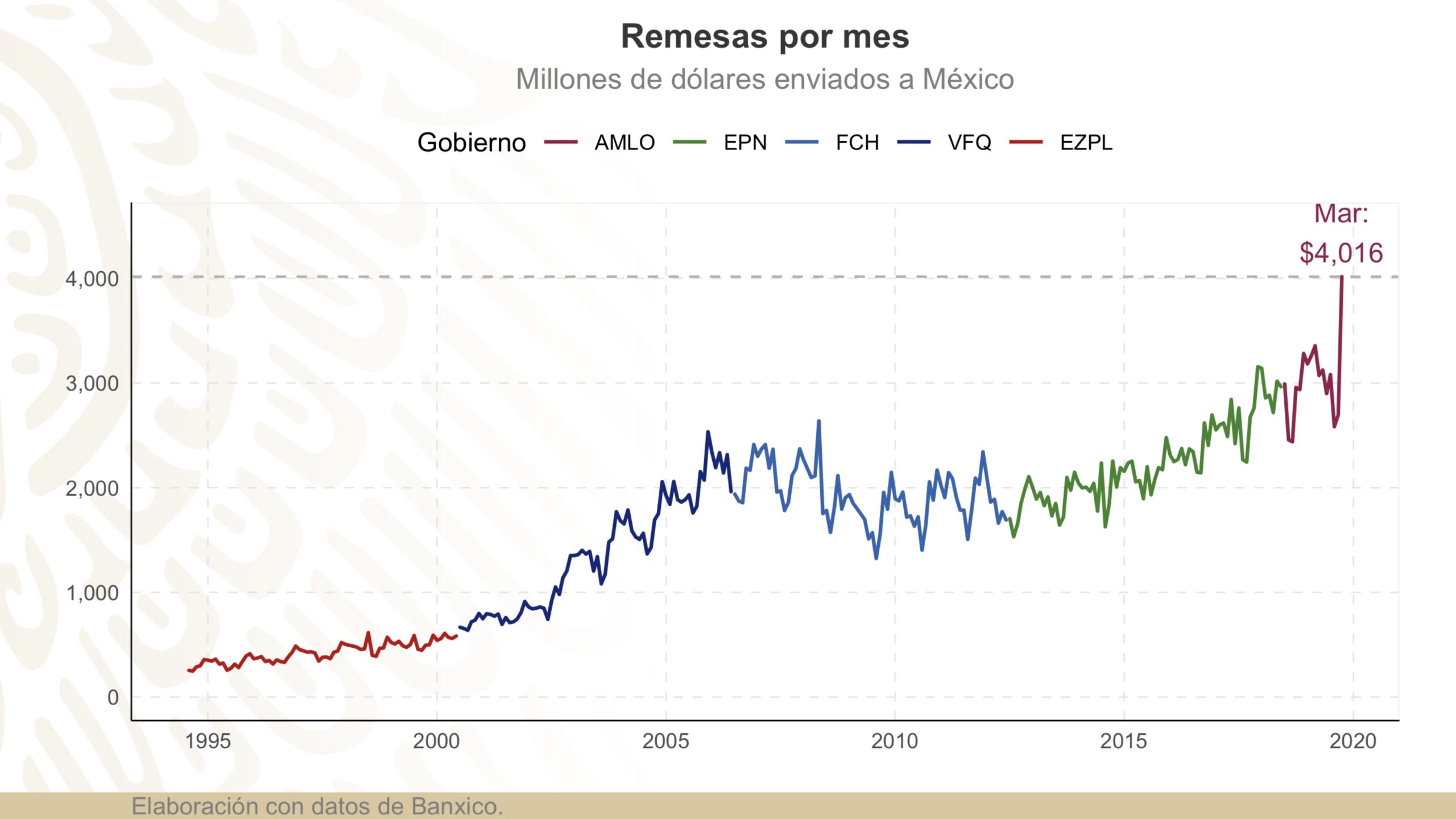 El mandatario destacó que en marzo de este año, a pesar de la crisis sanitaria y económica, fue un buen mes para las remesas provenientes de Estados Unidos. Los diez millones de envíos con 380 dólares en promedio favorecieron a los sectores bajos de la economía.