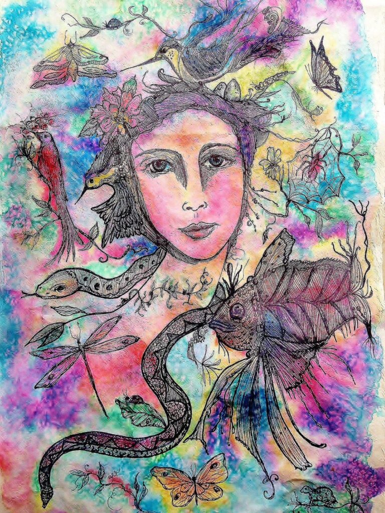 Mi trabajo es como si yo escribiera mi historia sobre cada trazo, siempre se ven imágenes femeninas son como una metáfora de la madre naturaleza, gestadora, creadora y dadora de vida y donde giran alrededor seres vivientes.