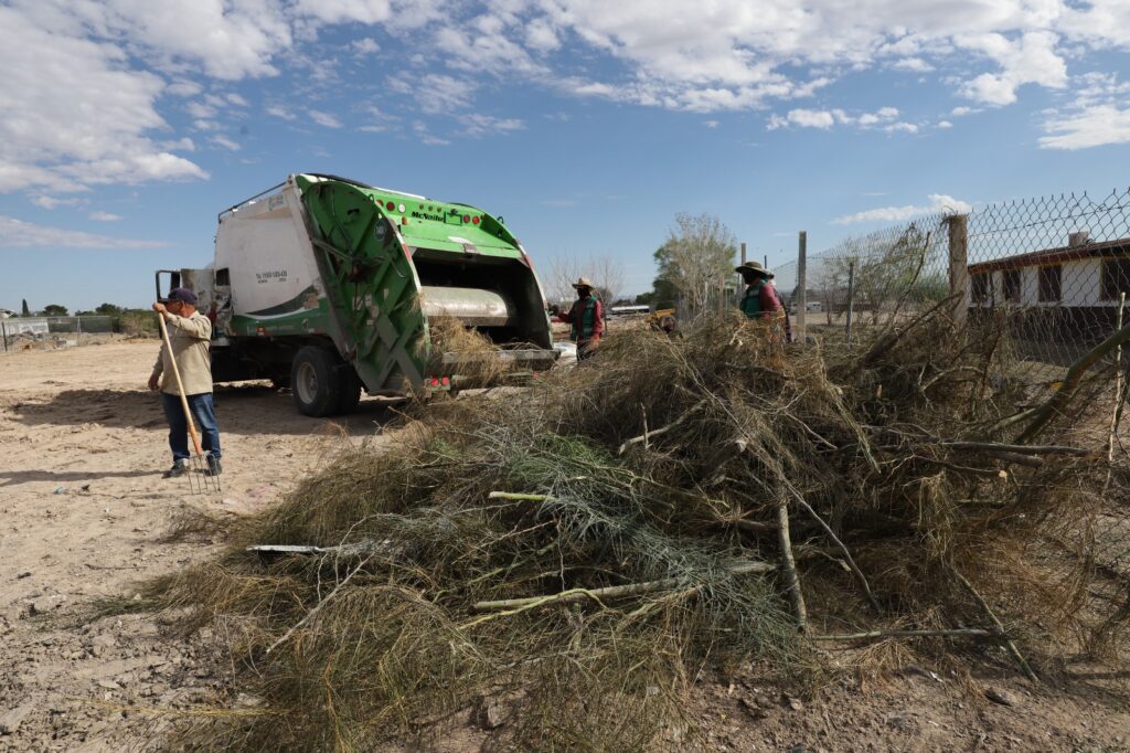CD. JUAREZ, CHIH.- En el marco de la Cruzada por Juárez que se efectuará mañana sábado, las cuadrillas de las direcciones de Limpia, Parques y Jardines y Alumbrado Público realizaron labores de mantenimiento integral en la colonia Águilas de Zaragoza, con el objetivo de mantener espacios públicos limpios, seguros y bien iluminados.