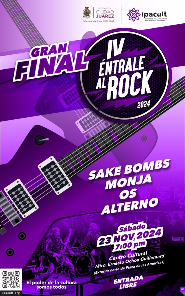 CD. JUAREZ, CHIH.- El Instituto para la Cultura del Municipio de Juárez (IPACULT) invita a toda la comunidad fronteriza a disfrutar de la emocionante final de Éntrale al Rock 2024, este próximo sábado 23 de noviembre a las 7:00 de la tarde, el Centro Cultural Ernesto Ochoa Guillemard.