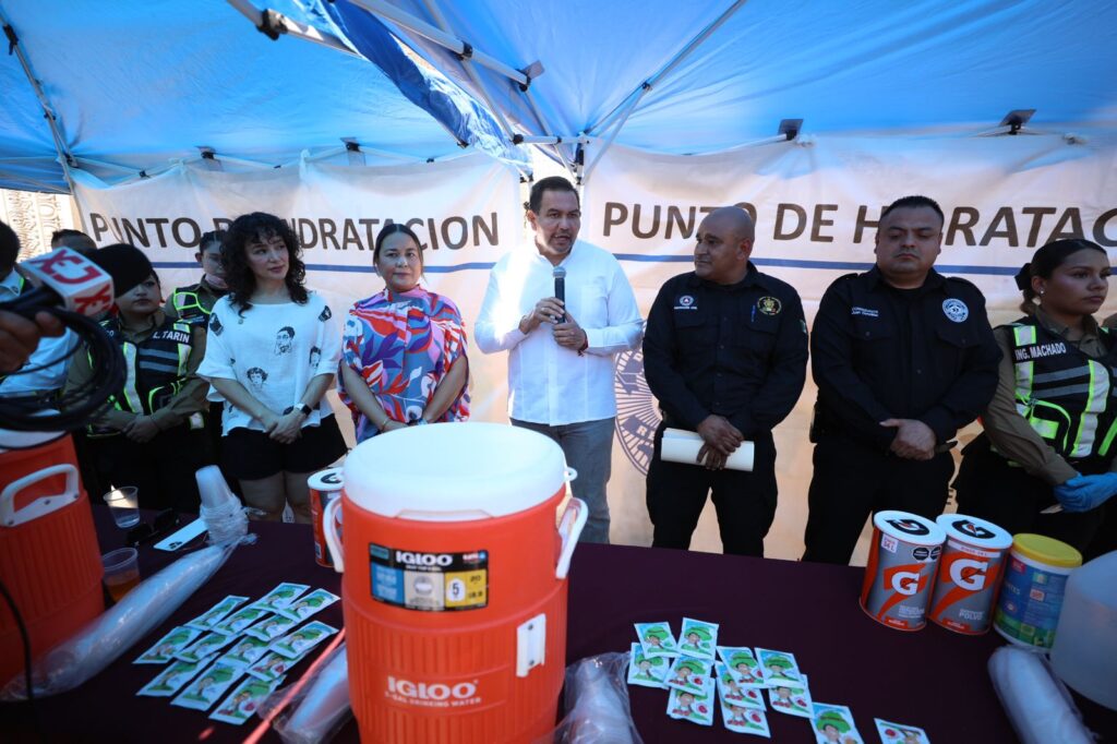 CD. JUAREZ, CHIH.- El Gobierno Municipal, a través de la Dirección General de Protección Civil, dio arranque oficial a la campaña de hidratación 2024 que tiene como propósito atender a los juarenses que circulan en la Zona Centro y en el Puente Internacional Paso del Norte, dotándolos de bebidas para evitar golpes de calor.