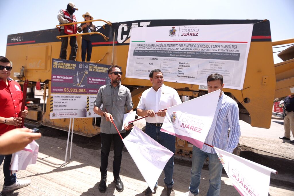 CD. JUAREZ, CHIH.- Como parte del Programa de Mejoramiento de Vialidades, el Presidente Municipal, Cruz Pérez Cuéllar, dio el banderazo de arranque a las obras de repavimentación de dos tramos de la avenida Tecnológico.