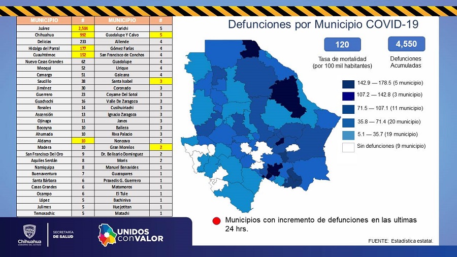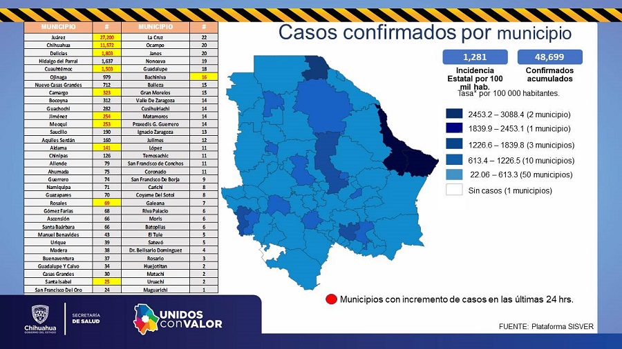 Los casos acumulados por municipio son: Ahumada 75, Aldama 141, Allende 79, Ascensión 66, Aquiles Serdán 160, Bachíniva 16, Batopilas 6, Bocoyna 312, Balleza 15, Buenaventura 37, Camargo 323, Carichí 8, Casas Grandes 30, Chihuahua 11,572, Chínipas 126, Coronado 11, Coyame del Sotol 8, Cuauhtémoc 1,503, Cusihuiriachi 14, Delicias 1,803, Dr. Belisario Domínguez 3, Galeana 7, Gómez Farías 68, Guachochi 282, Gran Morelos 15, Guadalupe 18, Guadalupe y Calvo 34, Guazapares 70 y Guerrero 74.