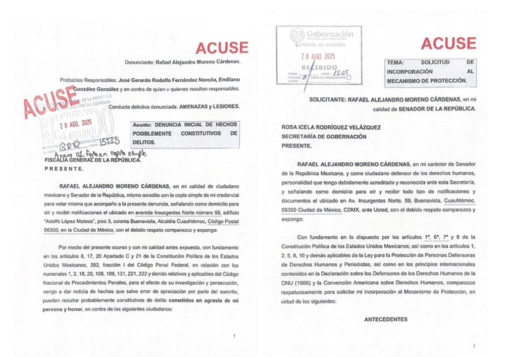 Al mismo tiempo, tras amenazas directas de Fernández Noroña y Emiliano González hacia su persona y hacia los legisladores Manuel Añorve, Rubén Moreira, Pablo Angulo, Erubiel Alonso y Carlos Gutiérrez Mancilla, solicitó ante la Secretaría de Gobernación (Segob) su incorporación al Mecanismo de Protección.