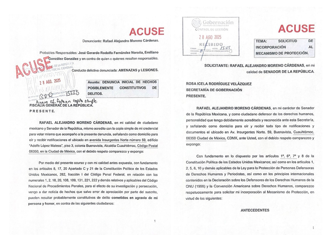 Explicó que en defensa propia y en defensa de la democracia, “acudimos a las instancias correspondientes frente a la intimidación y la persecución política que el Estado mexicano ejerce contra quienes pensamos distinto”.
