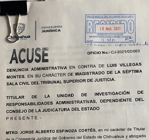 CHIHUAHUA, CHIH.- La Consejería Jurídica de Gobierno del Estado presentó una denuncia administrativa en contra del magistrado de la Séptima Sala Civil, Luis Villegas Montes, por los constantes ataques que de manera sistemática viene realizando al Gobierno del Estado y al gobernador de Chihuahua, Javier Corral Jurado.
