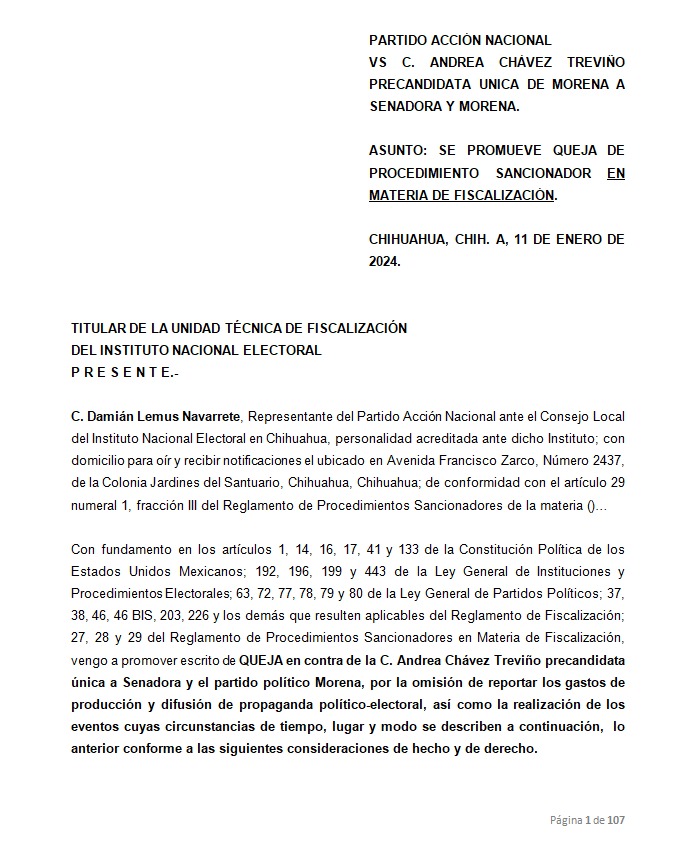 CHIHUAHUA, CHIH.- La Secretaría Jurídica del Comité Directivo Estatal del Partido Acción Nacional presentó una queja en materia de fiscalización, en contra de Andrea Chávez Treviño, ante el Instituto Nacional Electoral.