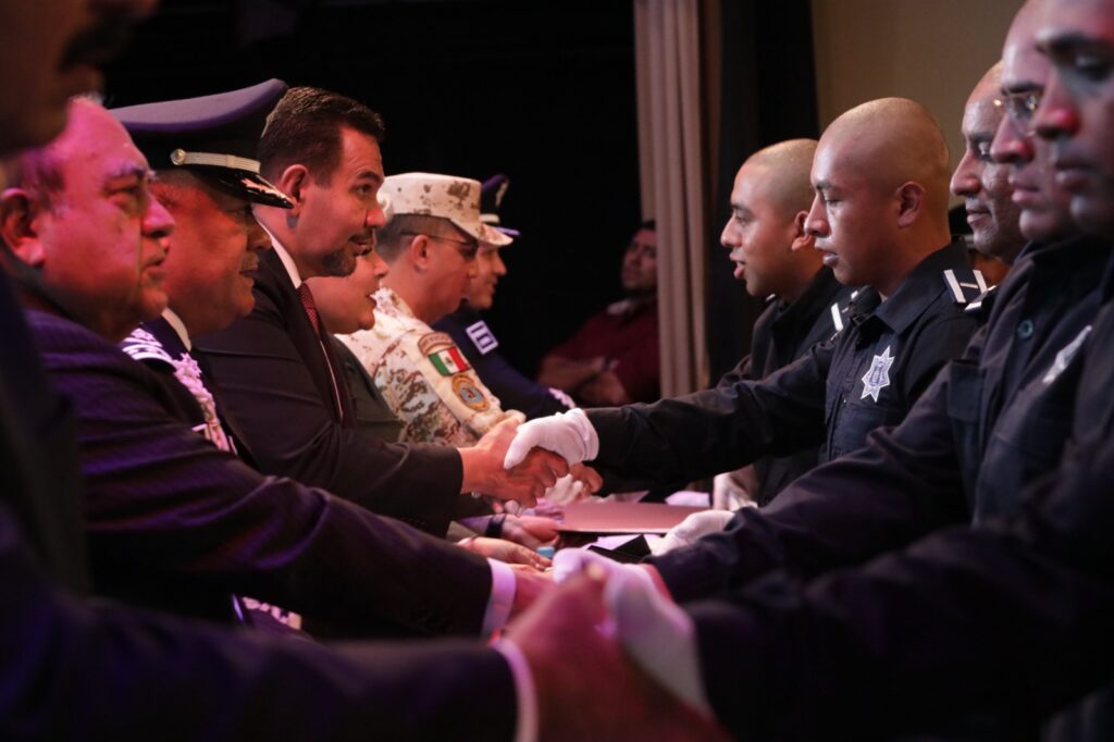 El Presidente Municipal, Cruz Pérez Cuellar, reconoció a los nuevos agentes por su dedicación y empeño para ejercer esta profesión que requiere principalmente de vocación y los exhortó a servir, proteger y efectuar la justicia en la ciudad.