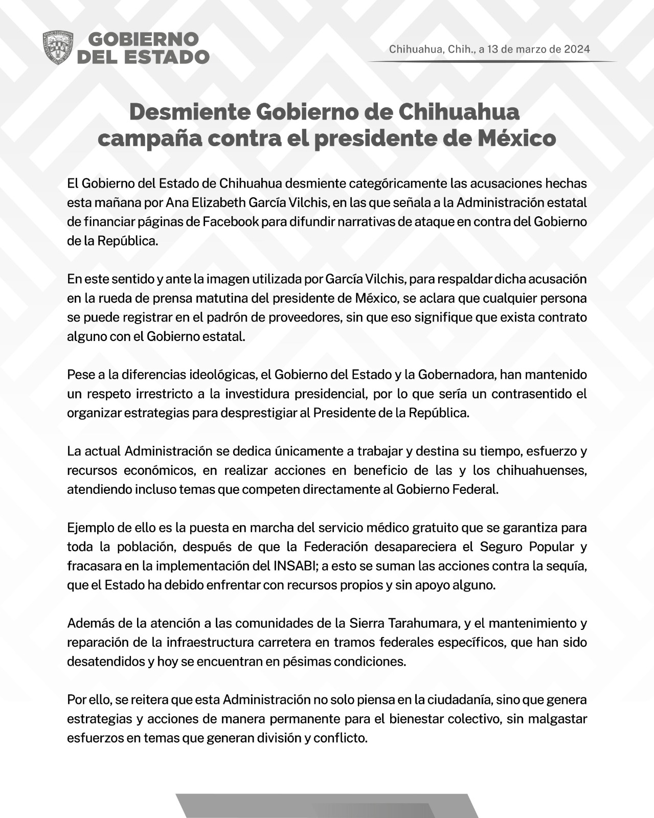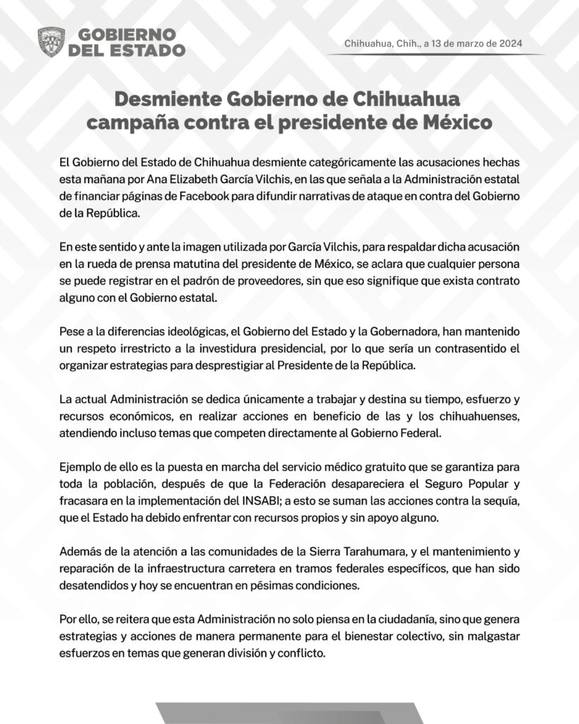 CHIHUAHUA.- El Gobierno del Estado de Chihuahua desmiente categóricamente las acusaciones hechas esta mañana por Ana Elizabeth García Vilchis, en las que señala a la Administración estatal de financiar páginas de Facebook para difundir narrativas de ataque en contra del Gobierno de la República.