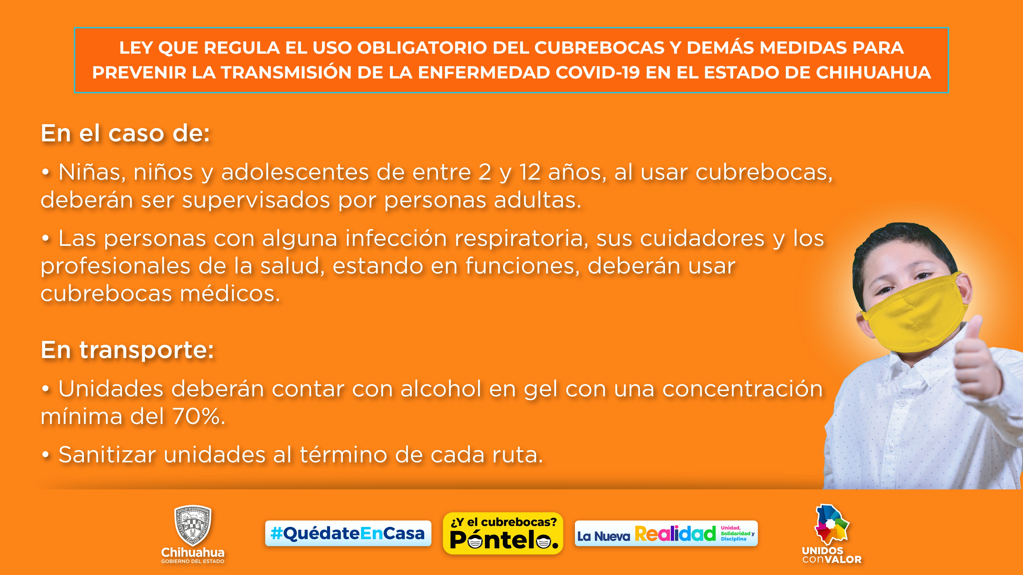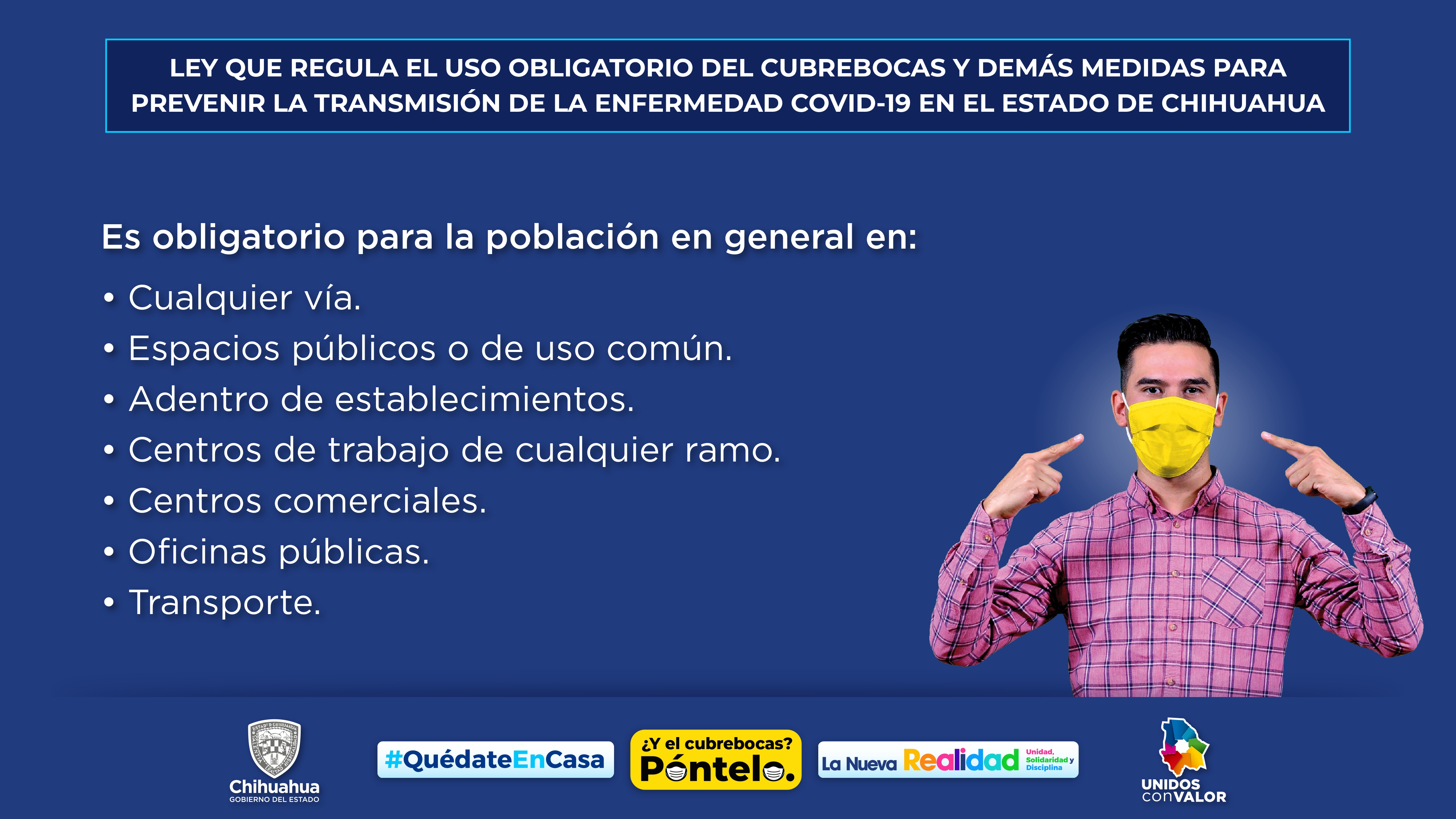 Informó que hasta que la autoridad sanitaria estatal declare oficialmente la conclusión de la pandemia, es obligatorio para la población en general el uso de cubrebocas en cualquier vía, espacios públicos o de uso común, dentro de establecimientos, centros de trabajo de cualquier ramo, centros comerciales, oficinas públicas y transporte.