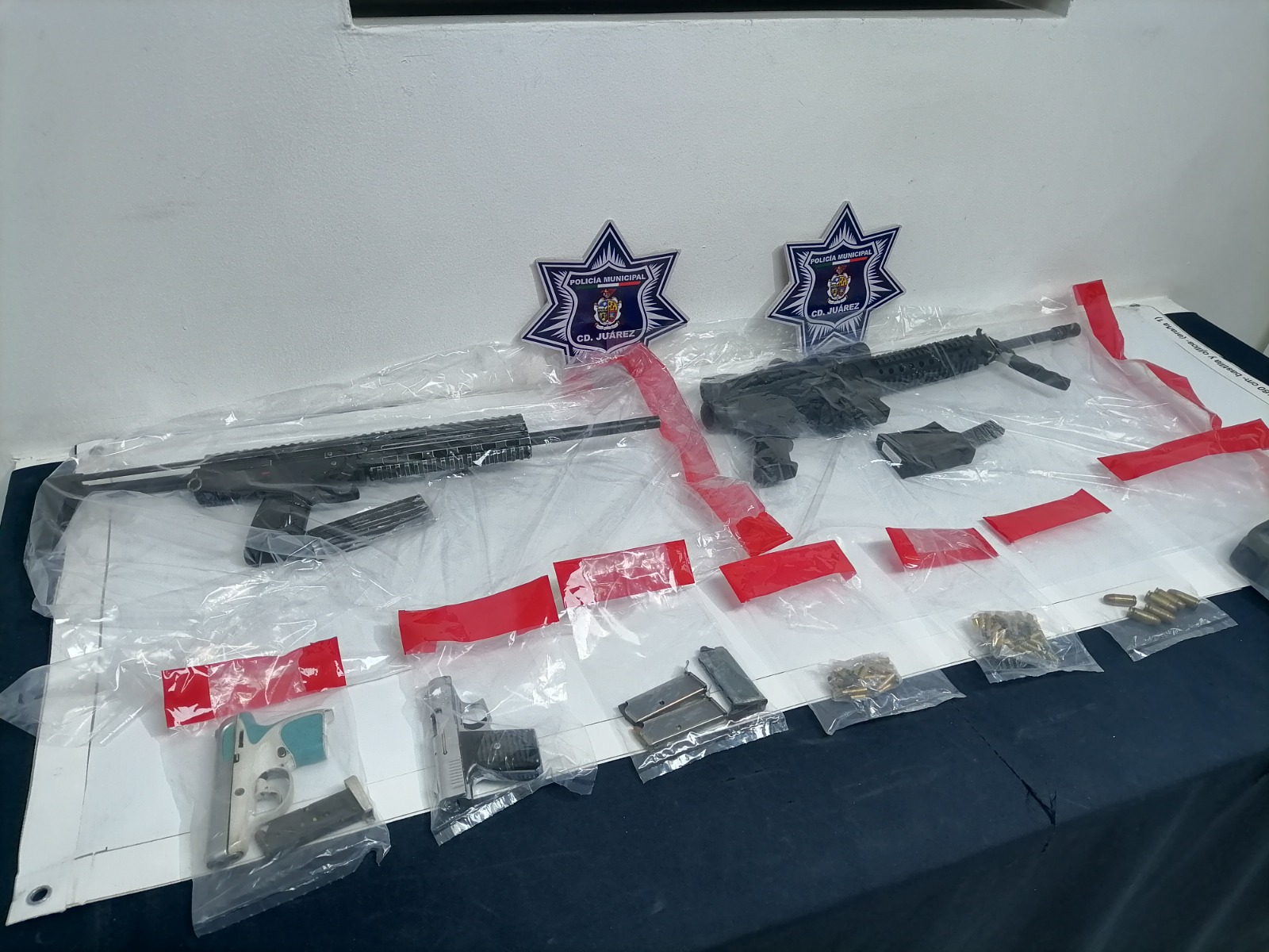 CD. JUAREZ, CHIH.- Elementos de la Secretaría de Seguridad Pública Municipal adscritos a la Estación de Policía del Distrito Poniente, arrestaron a cinco adultos y un adolescente por su presunta responsabilidad en la comisión de delitos contra la ley federal de armas de fuego y explosivos, tras asegurarles diversas armas de fuego y cartuchos útiles.