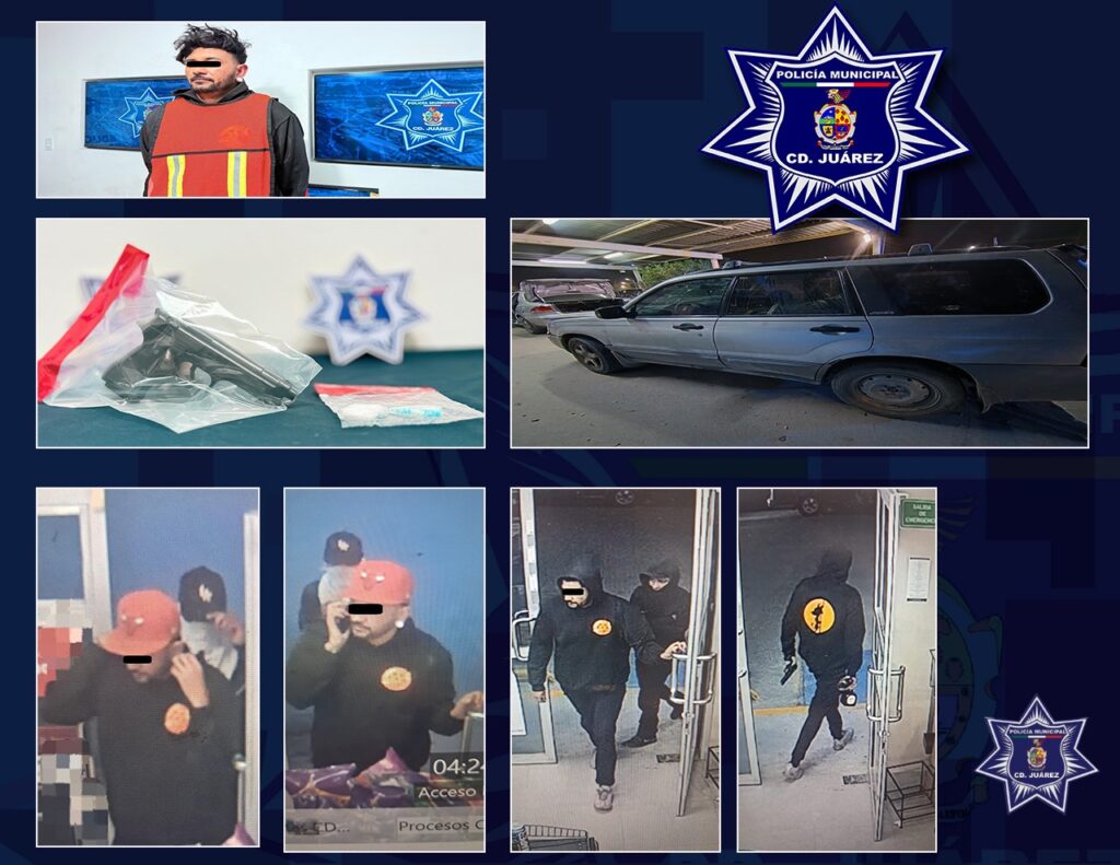 CD. JUAREZ, CHIH.- Elementos de la Secretaría de Seguridad Pública Municipal, adscritos a la Estación de Policía del Distrito Riveras, arrestaron a un hombre identificado como César Jeovanni M. M., por su presunta responsabilidad en la comisión de delitos contra la salud, quien además será investigado por su posible participación en robos a casa comercial con lujo de violencia.