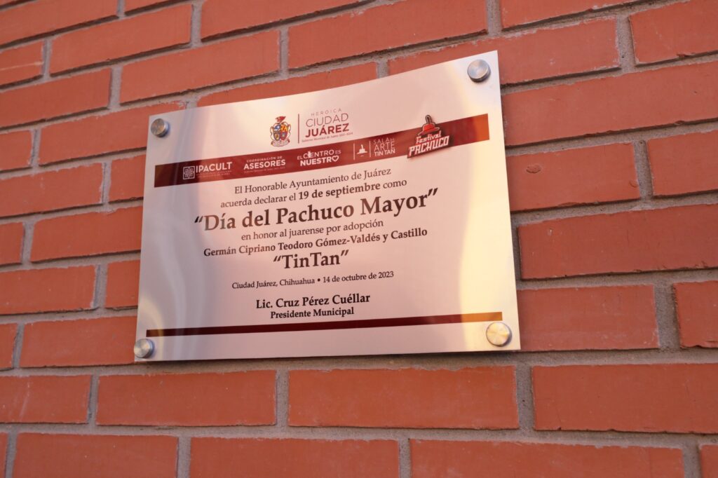 CD. JUAREZ, CHIH.- En el marco del Festival del Pachuco, el Presidente Municipal, Cruz Pérez Cuéllar, develó un mural alusivo al comediante Germán Cipriano Teodoro Gómez-Valdés y Castillo «Tin Tan» y una placa que establece el 19 de septiembre como el «Día del Pachuco Mayor», en honor al juarense por adopción.