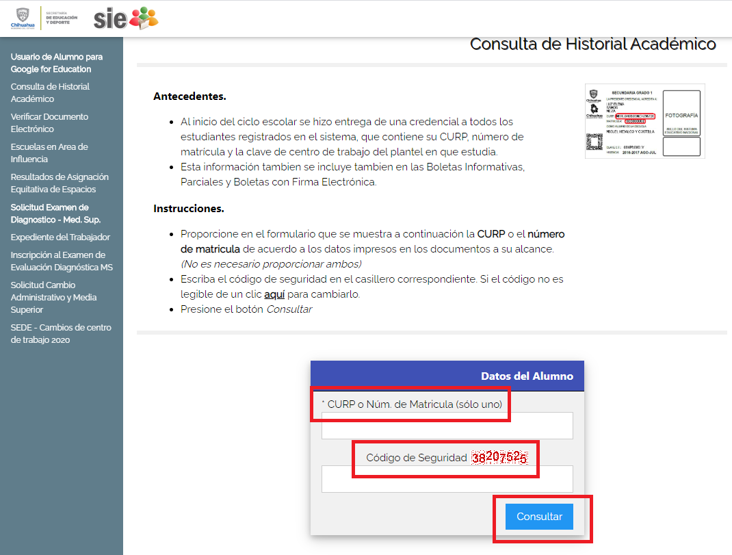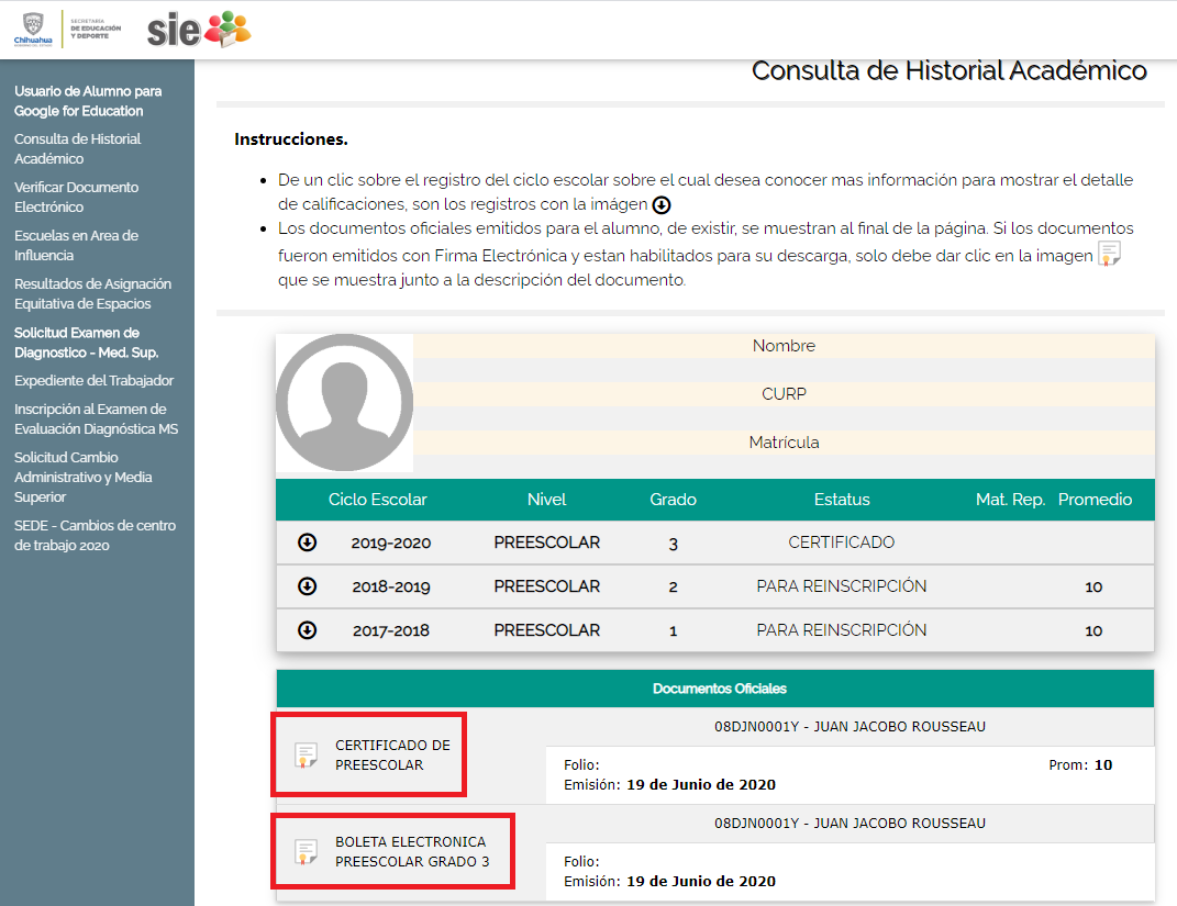 Para esto, las y los interesados en imprimir estos documentos y consultarlos tendrán que acceder al sitio web del Sistema de Información Educativa (SIE) http://sie.chihuahua.gob.mx/publico y deberán seleccionar la opción de Consulta de Historial Académico.
