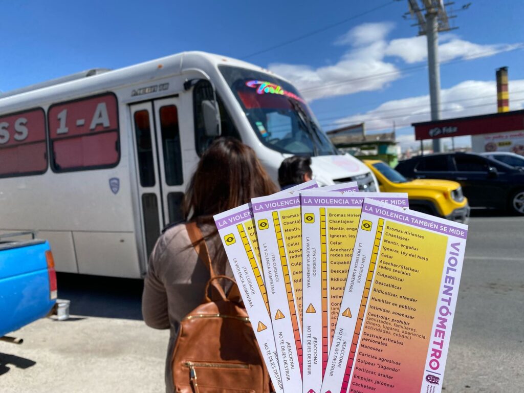 CD. JUAREZ, CHIH.- Como parte de las actividades que se han realizado por el mes de la mujer, personal de la Dirección de Derechos Humanos, distribuyó violentómetros a los pasajeros de la Ruta Express 1ª, que circula por la avenida Óscar Flores.