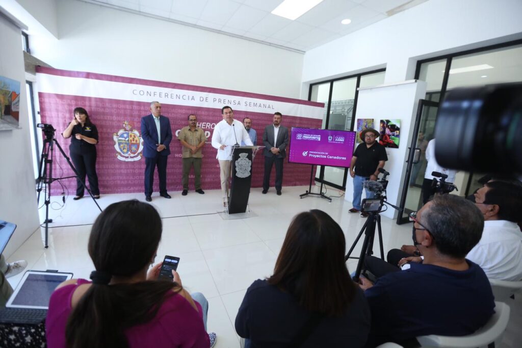 Durante la conferencia de prensa semanal que ofrece el Presidente Municipal, Cruz Pérez Cuéllar.