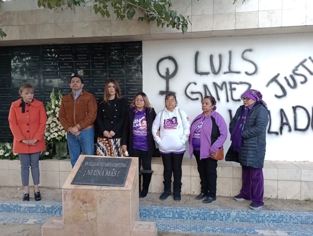 El alcalde, Cruz Pérez Cuéllar acompañado de su esposa Rubí Enríquez, hicieron entrega de un arreglo floral, para recordar la memoria de las víctimas de feminicidio encontradas en un campo algodonero.