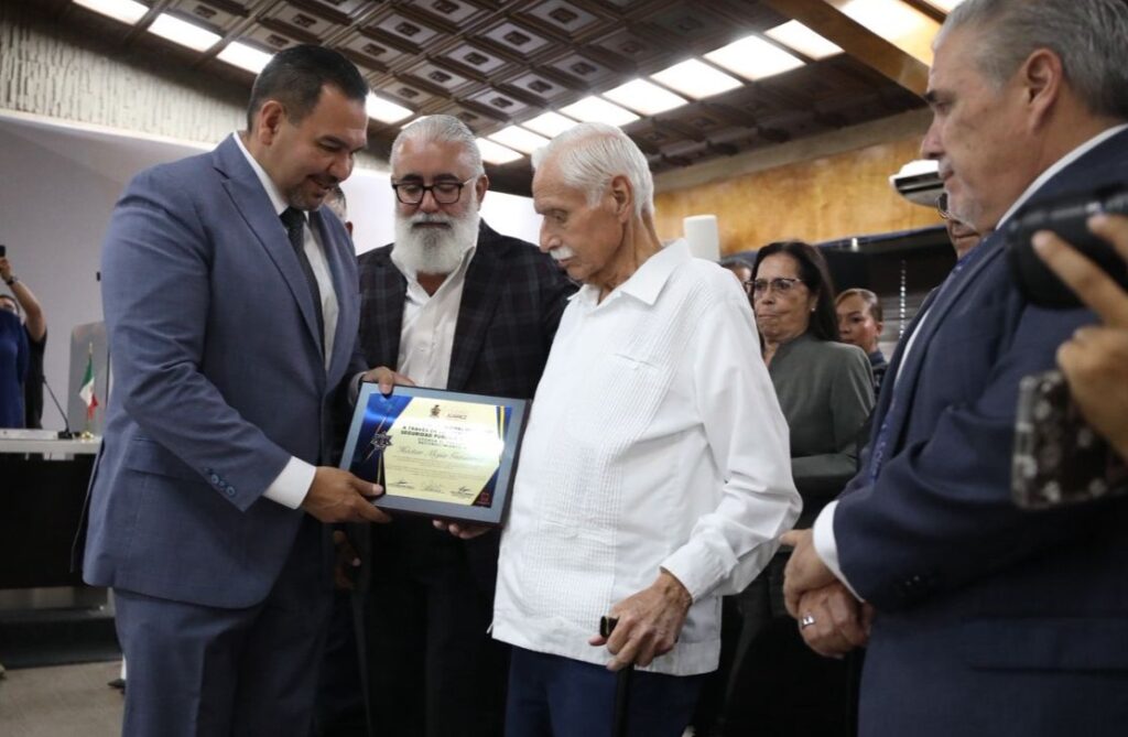 CD. JUAREZ, CHIH.- En sesión extraordinaria de Cabildo, el Ayuntamiento le entregó hoy un reconocimiento al ex jefe de policía en la década de los 80s Héctor Mejía Gutiérrez, por su trabajo y servicio a la comunidad; en su honor el auditorio de la Academia de Policía llevará su nombre.