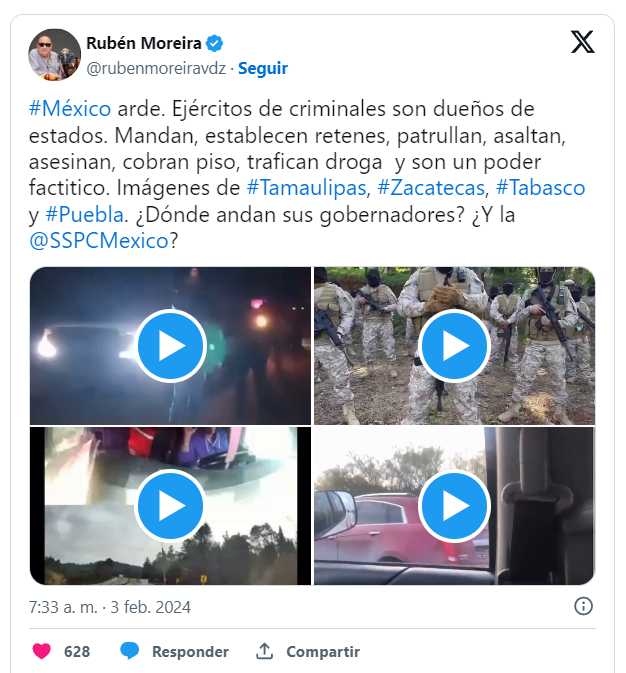 «#México arde. Ejércitos de criminales son dueños de estados. Mandan, establecen retenes, patrullan, asaltan, asesinan, cobran piso, trafican droga y son un poder factico. Imágenes de #Tamaulipas, #Zacatecas, #Tabasco y #Puebla. ¿Dónde andan sus gobernadores? ¿Y la @SSPCMexico?», escribió el líder parlamentario en su cuenta de X.