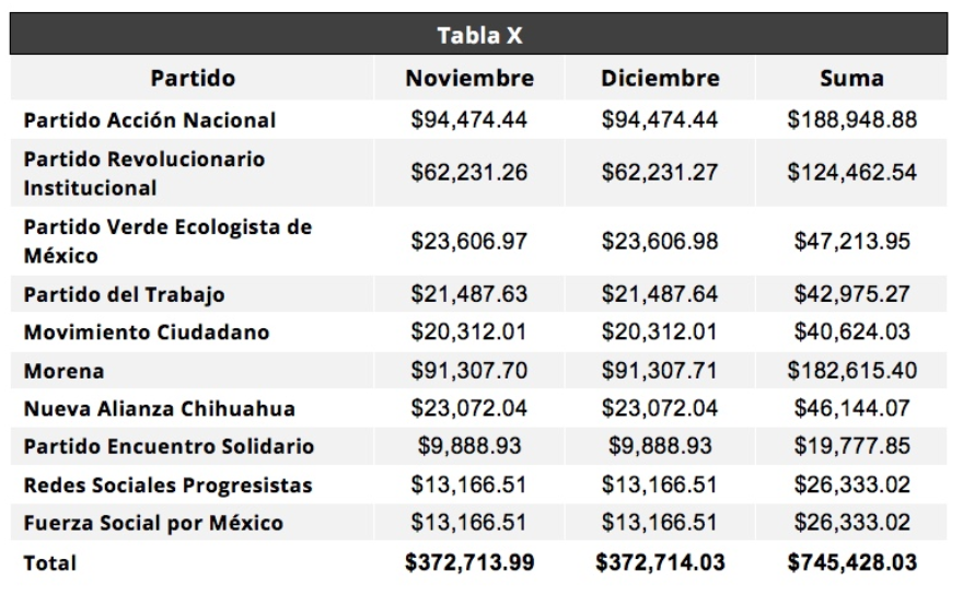 El financiamiento ordinario para los partidos Redes Sociales Progresistas y Fuerza Social por México se hará en dos mensualidades por un importe de $294,059.75 M.N., cada una, a cada uno de esos partidos, quedando la distribución de la siguiente forma: