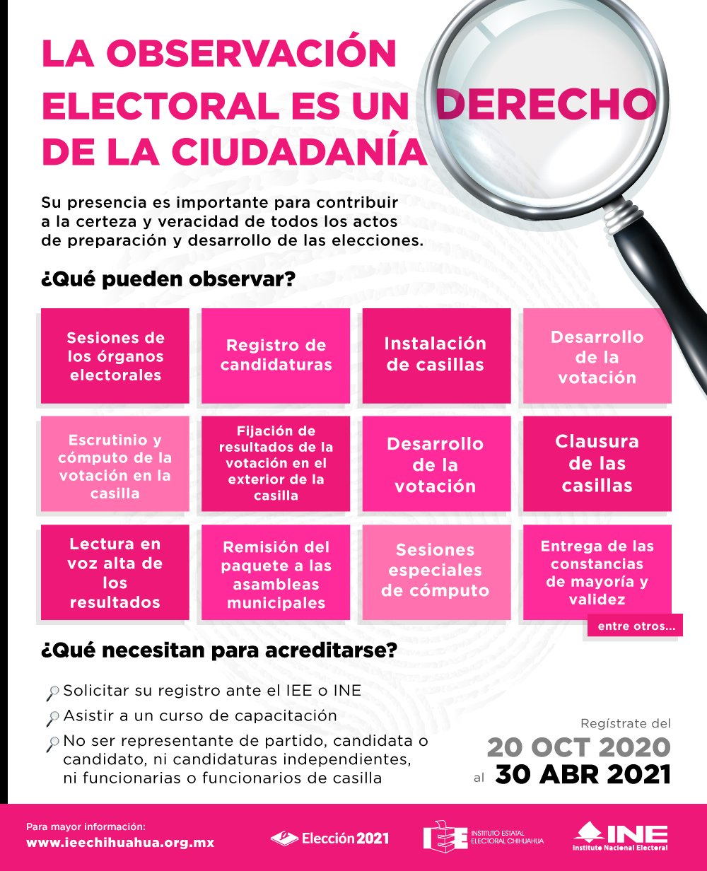 Es por ello, el Instituto Estatal Electoral de Chihuahua reitera la invitación a toda la ciudadanía a participar como observadoras y observadores electorales durante el Proceso Electoral 2020-2021.