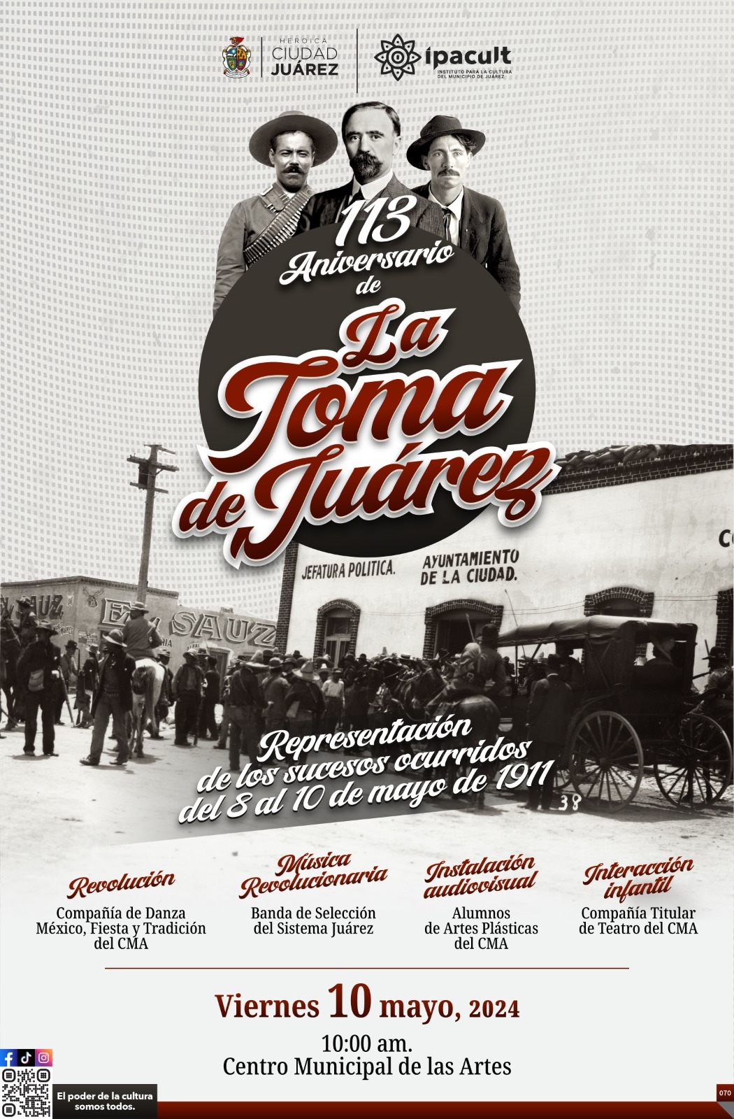 CD. JUAREZ, CHIH.- Con música, danza y teatro, así se llevará a cabo la conmemoración del 113 aniversario de “La toma de Ciudad Juárez”, por parte del Instituto para la Cultura. En esta ocasión será frente al edificio del Centro Municipal de las Artes (CMA).