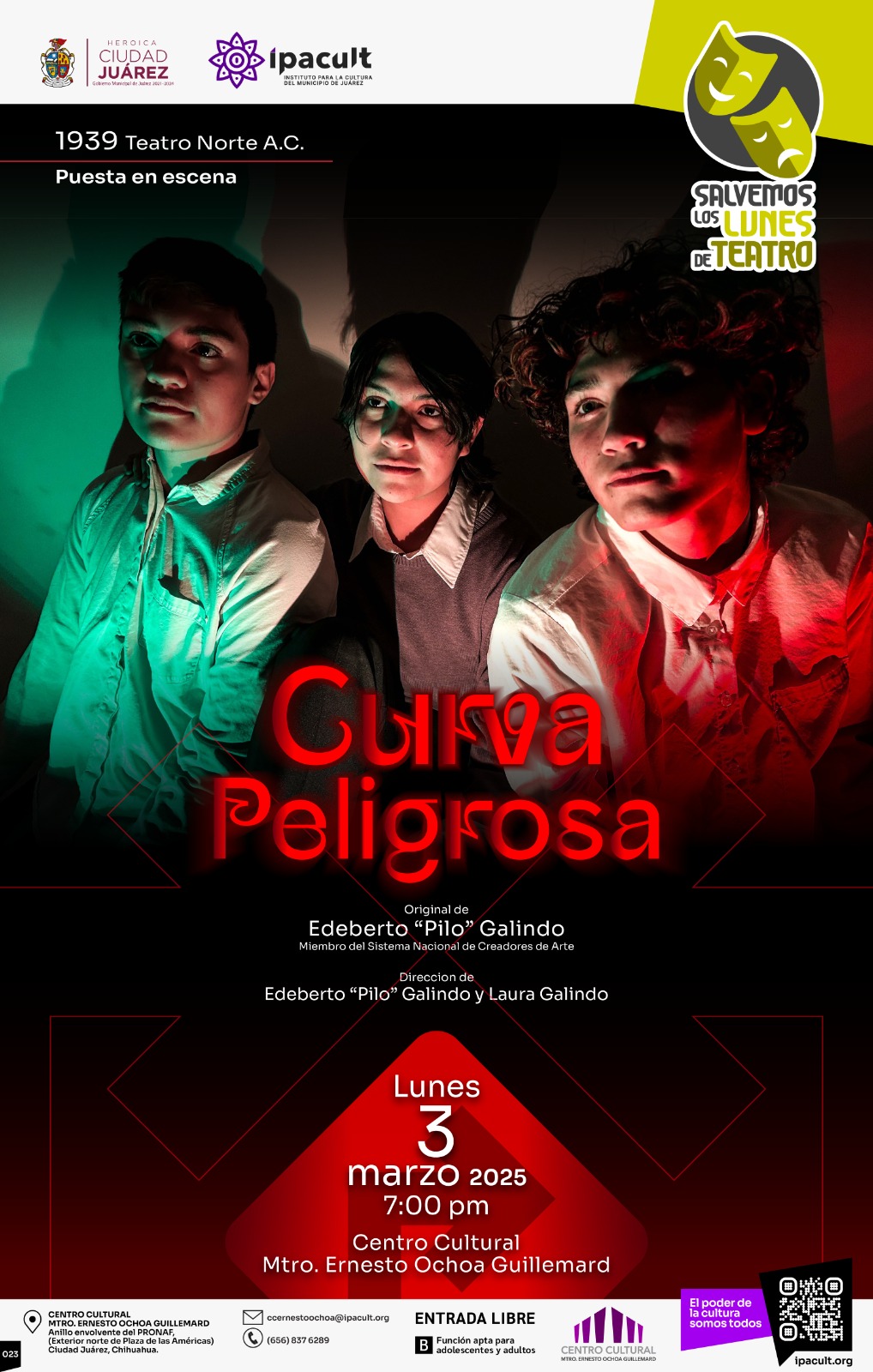 CD. JUAREZ, CHIH.- El Instituto para la Cultura del Municipio de Juárez (IPACULT) reafirma su compromiso con la difusión del arte y la cultura en la ciudad al invitar a la comunidad juarense a disfrutar de manera gratuita la puesta en escena «Curva Peligrosa», del reconocido dramaturgo Edeberto «Pilo» Galindo.