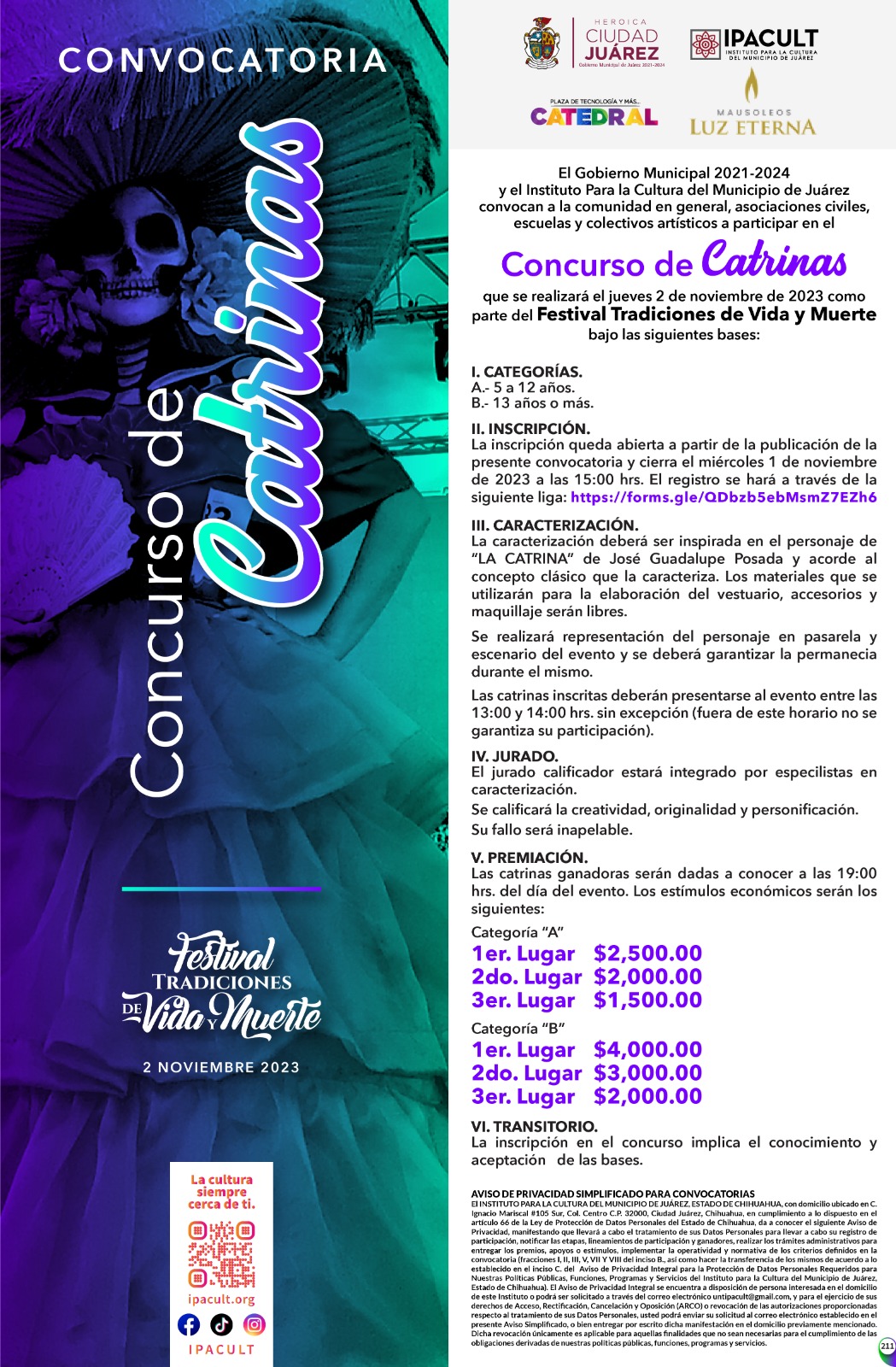 CD. JUAREZ, CHIH.- El Gobierno Municipal de Juárez 2021-2024, a través del Instituto para la Cultura del Municipio de Juárez (IPACULT), convoca a la comunidad, asociaciones civiles, escuelas y colectivos artísticos a formar parte del concurso de catrinas, evento que se llevará a cabo el día 02 de noviembre, dentro del “Festival Tradiciones Vida y Muerte”.