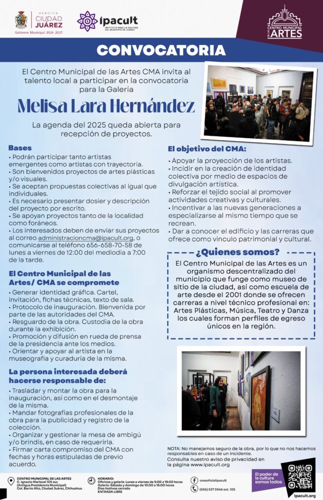 CD. JUAREZ, CHIH.- El Instituto para la Cultura del Municipio de Juárez (IPACULT) y el Centro Municipal de las Artes (CMA) lanzan una convocatoria abierta para artistas locales interesados en exponer en la galería “Melisa Lara Hernández”, inscribiéndose en la agenda del año 2025, la cual está disponible para la recepción de propuestas, ofreciendo una plataforma para que tanto artistas emergentes como consolidados puedan mostrar su talento.