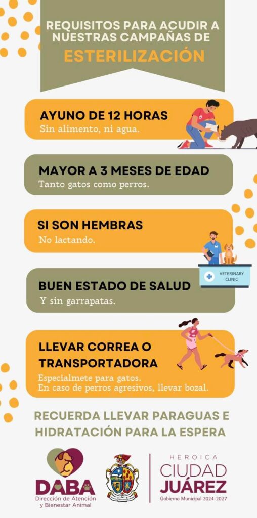 CD. JUAREZ, CHIH.- En dos semanas se estará llevando a cabo la próxima Campaña de Esterilización gratuita por parte del Gobierno Municipal, por lo que la Dirección de Atención y Bienestar Animal (DABA) emite varias recomendaciones a la ciudadanía, a fin de que cuiden a sus mascotas y reciban un mejor servicio.