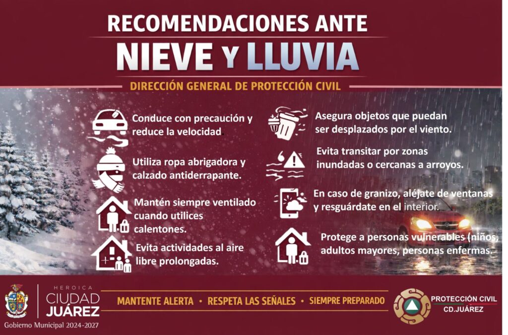 CD. JUAREZ, CHIH.- La Dirección General de Protección Civil emitió un aviso preventivo la mañana de este 25 de enero de 2026, ante la continuidad de precipitaciones en forma de lluvia, aguanieve y nieve en distintos sectores de la ciudad.