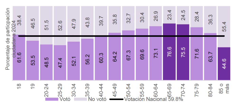 También se observó un incremento en la participación de personas adultas mayores en 2024 con respecto a las elecciones de 2018. Los grupos de edad de 60 a 79 años superaron el 70 % de asistencia a las urnas.