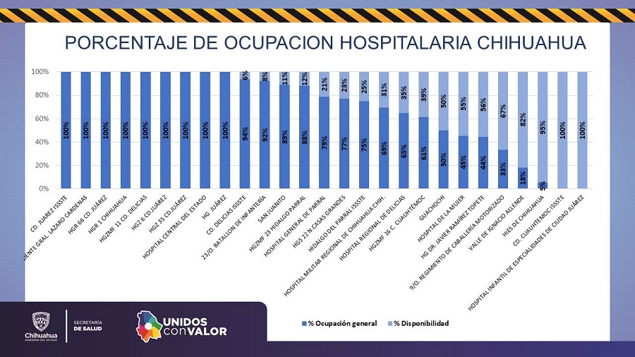 La gráfica de ocupación hospitalaria en el estado de Chihuahua muestra que nueve hospitales están al 100%, cuatro por encima del 80%, seis tienen menos el 40% de camas disponibles y ocho tienen más del 50% de capacidad.