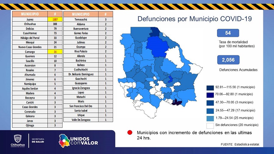 Del total de fallecimientos, 1 mil 307 corresponden a Ciudad Juárez, 388 a Chihuahua, 79 Delicias, 73 Cuauhtémoc, 33 Parral, 24 Meoqui, 21 Nuevo Casas Grandes, 2 Guadalupe, 8 Ascensión, 16 Camargo, 12 Guerrero, 10 Saucillo, 7 Rosales, 1 Bachíniva, 2 Buenaventura, 1 Ignacio Zaragoza, 1 San Francisco del Oro, 4 Madera, 3 Coronado, 3 Ojinaga, 1 Valle de Zaragoza, 3 Bocoyna, 1 Moris, 2 Gómez Farías, 6 Jiménez, 1 Urique, 3 Casas Grandes, 1 Allende, 3 Janos, 3 Galeana, 2 Ocampo, 4 Aquiles Serdán, 1 Balleza, 1 Matachí, 5 Namiquipa, 2 Riva Palacio, 2 Julimes, 1 Guazapares, 3 Carichí, 6 Ahumada, 1 Cusihuiriachi, 2 Aldama, 1 Belisario Domínguez, 1 Santa Isabel, 1 Guachochi, 1 López y 3 Temósachic.