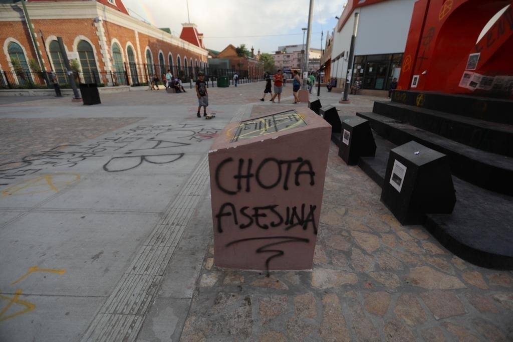 CD. JUÁREZ, CHIH.- Docenas de jóvenes encapuchados protestaron en contra del abuso de autoridad con mensajes plasmados en cartulinas con las leyendas “Violadores, asesinos con uniformes”, y “La Chota no me cuida”; dañando y grafiteando los monumentos.
