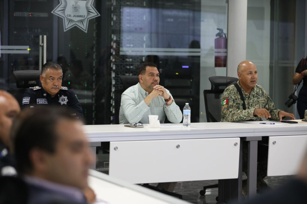 CD. JUAREZ, CHIH.- El Presidente Municipal, Cruz Pérez Cuéllar, en coordinación con las diferentes corporaciones de seguridad de los tres órdenes de gobierno, encabezó la Mesa de Coordinación para la Construcción de la Paz, la cual se llevó a cabo en el Centro de Emergencia y Respuesta Inmediata de la Secretaría de Seguridad Pública Municipal.