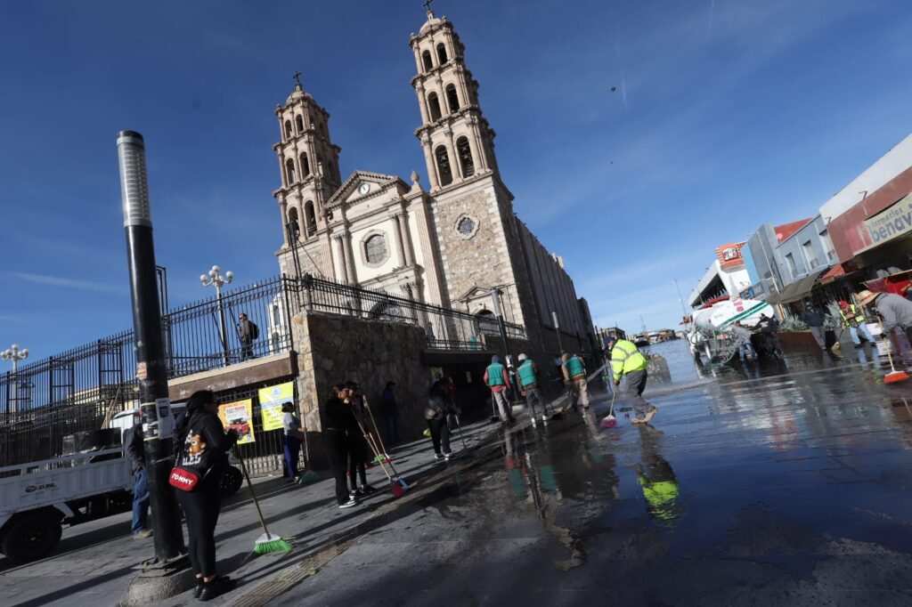 CD. JUAREZ, CHIH.- El Secretario del Ayuntamiento, Héctor Rafael Ortiz Orpinel, encabezó esta mañana un operativo integral de limpieza en el primer cuadro de la ciudad, en el que se sumaron los comerciantes y el personal operativo de la Dirección de Limpia, con el fin de reforzar las acciones de ordenamiento y mejoramiento de la imagen urbana del Centro Histórico.