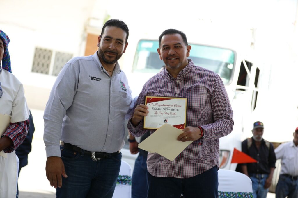 Además del camión recolector se entregó un contenedor para que los habitantes puedan depositar su basura y previamente se les había entregado una patrulla, por lo que las autoridades de Carichí agradecieron al Presidente Pérez Cuéllar, entregándole un reconocimiento por todo el apoyo otorgado.