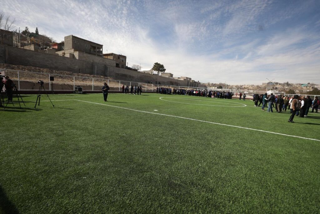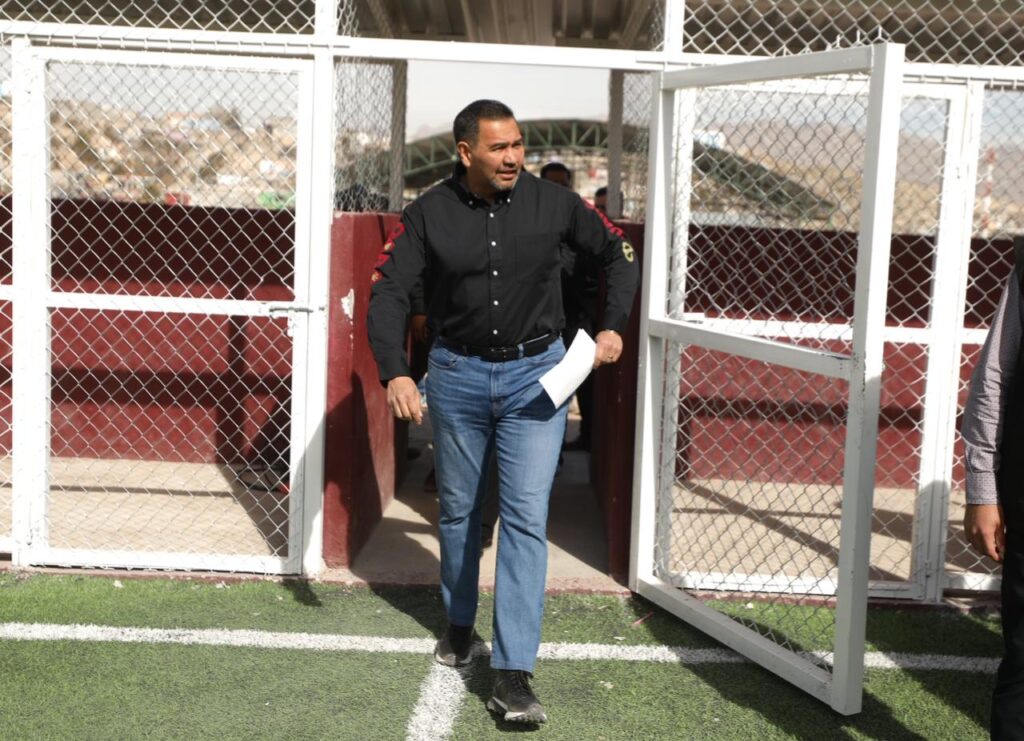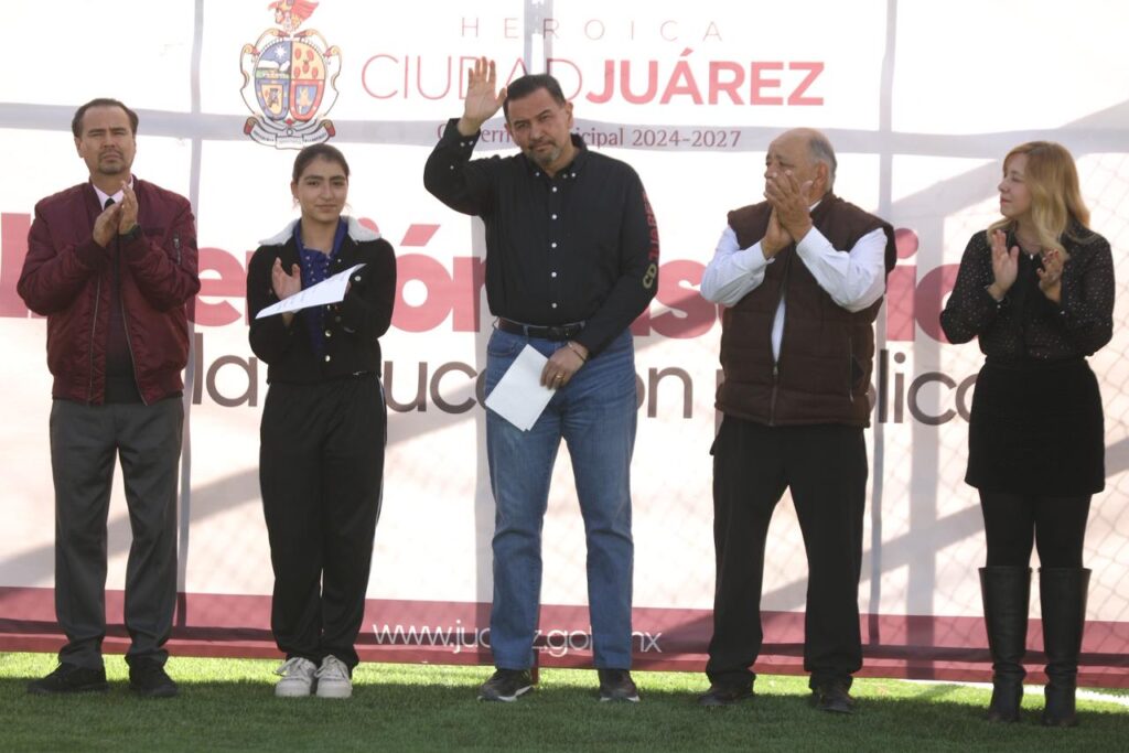 CD. JUAREZ, CHIH.- El Presidente Municipal, Cruz Pérez Cuéllar, realizó la entrega de una cancha de fútbol con pasto sintético a la comunidad de Escuela Secundaria Técnica 56, obra realizada a través del Presupuesto Participativo y que beneficiará a estudiantes y a la comunidad escolar en general.