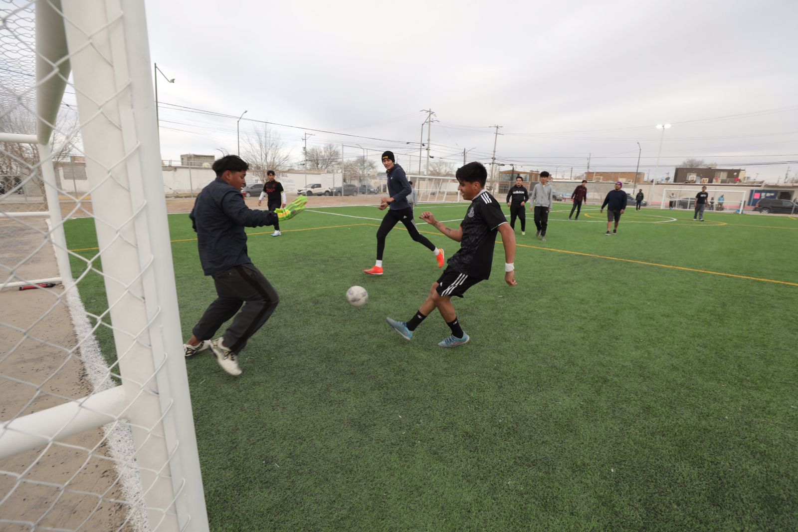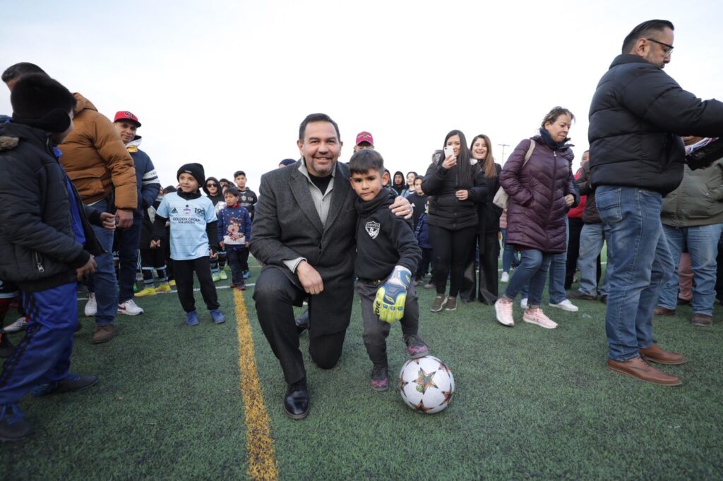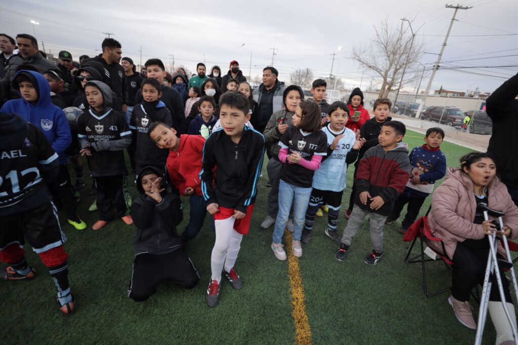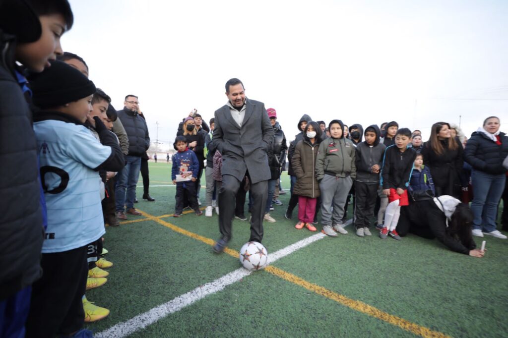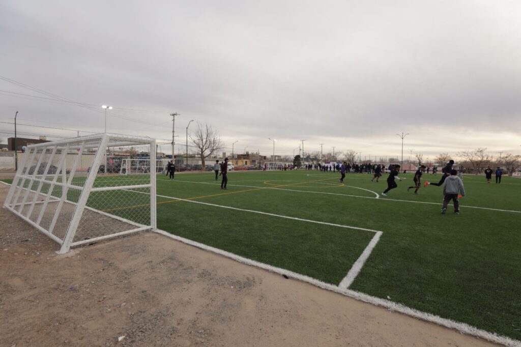 CD. JUAREZ, CHIH.- Con más de 2 mil 700 metros cuadrados de pasto sintético, malla ciclónica, alumbrado y adecuaciones para evitar inundaciones, fue entregada una cancha de fútbol a vecinos del Fraccionamiento Praderas de la Sierra.