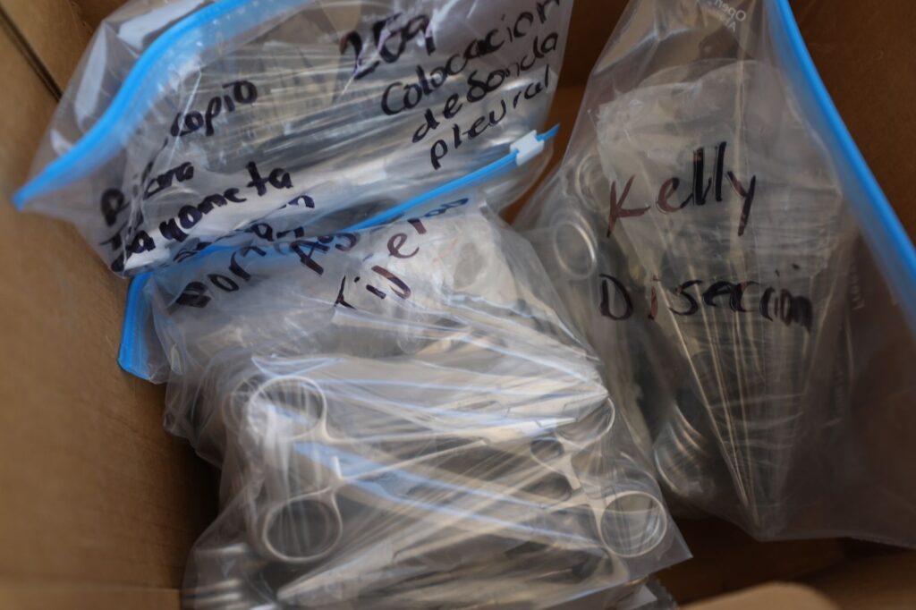 El material que se donó fueron 300 mil rótulos de solución con adhesivo y 464 piezas de equipo quirúrgico consistentes en equipos de sutura, para aplicación de catéter venoso, para colocación de sonda pleural, equipo para retiro de puntos y para exploración de oídos u orificios nasales.